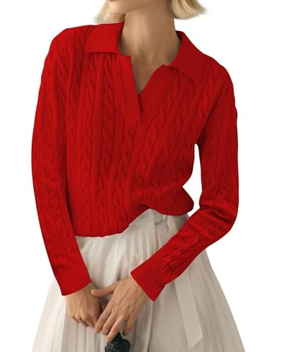 LACOZY Womens Sweaters Polo V Neck Cable Knit Sweater Dressy Casual Pullover Jumper Tops Fall Winter Trendy Red S