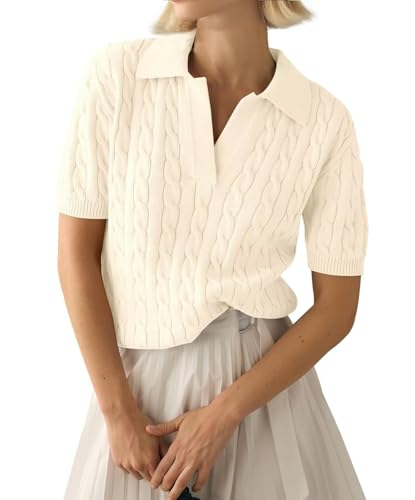 LACOZY Women Summer Short Sleeve Sweater Pullover Polo Tops V Neck Knit Casual Soft Pullover Shirt Apricot S