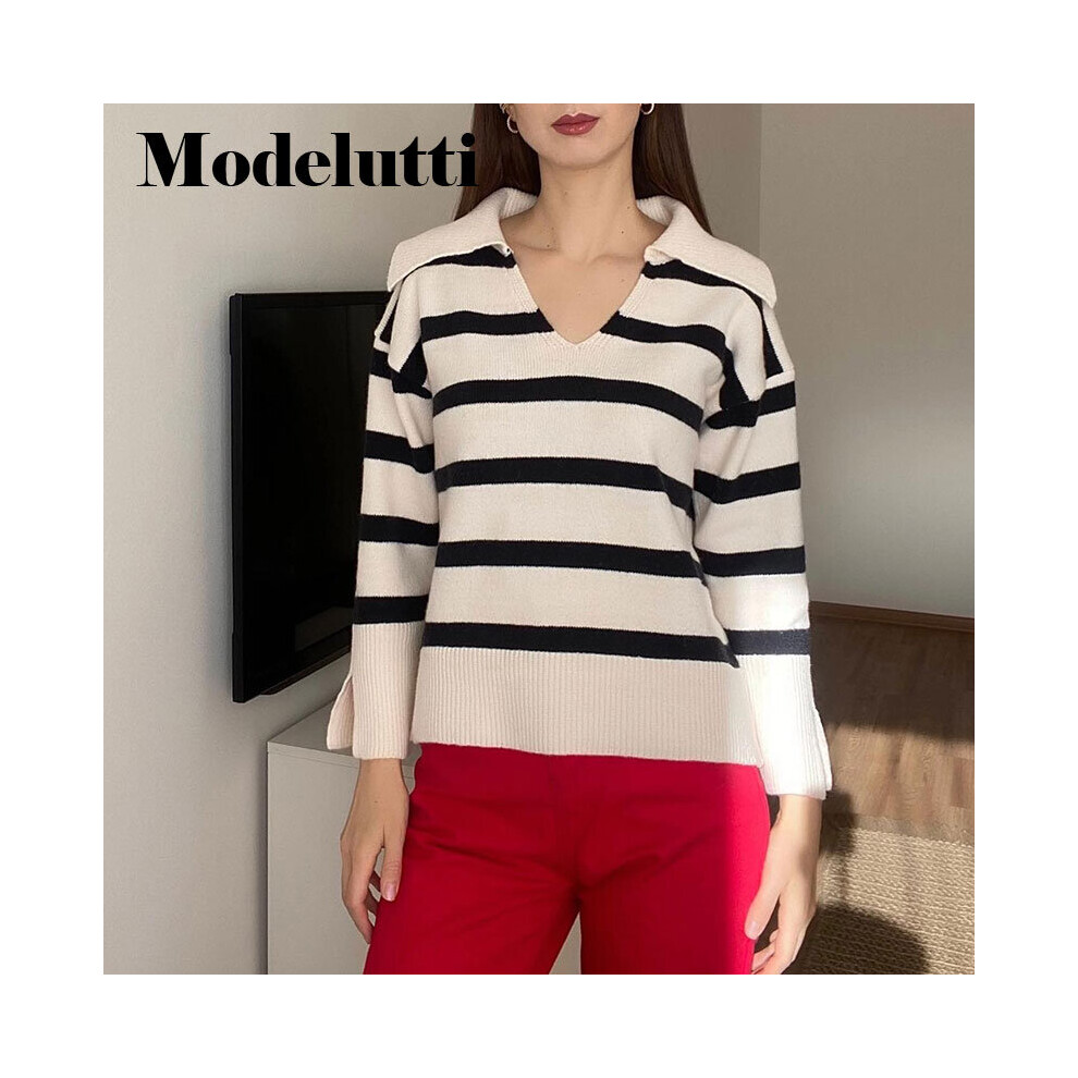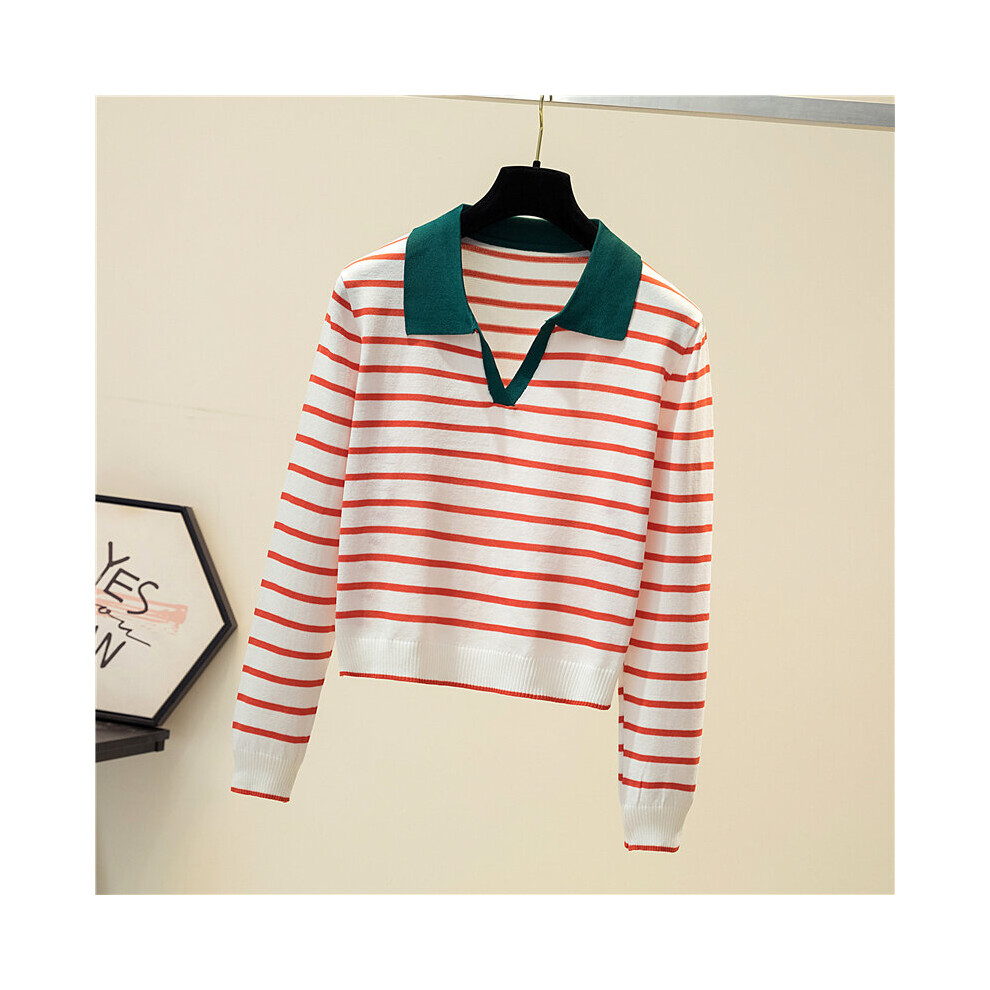 Autumn Polo Collar Stripe Women Knitted Sweater V-neck Long Sleeve Loose Woman Pullover Sweaters Thin Casual Knitted Tops