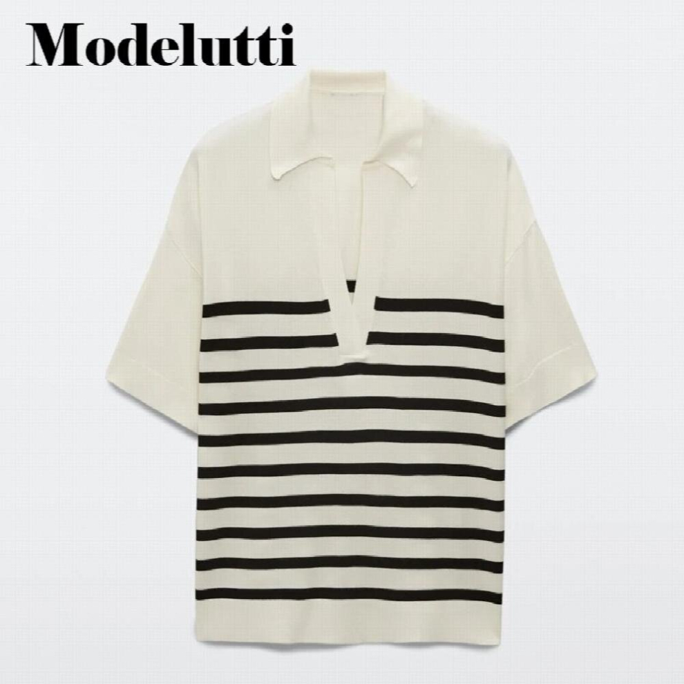 Spring Autumn V-Neck Knitted Sweater Striped Short Sleeve Polo Shirt Women Casual Tops Female