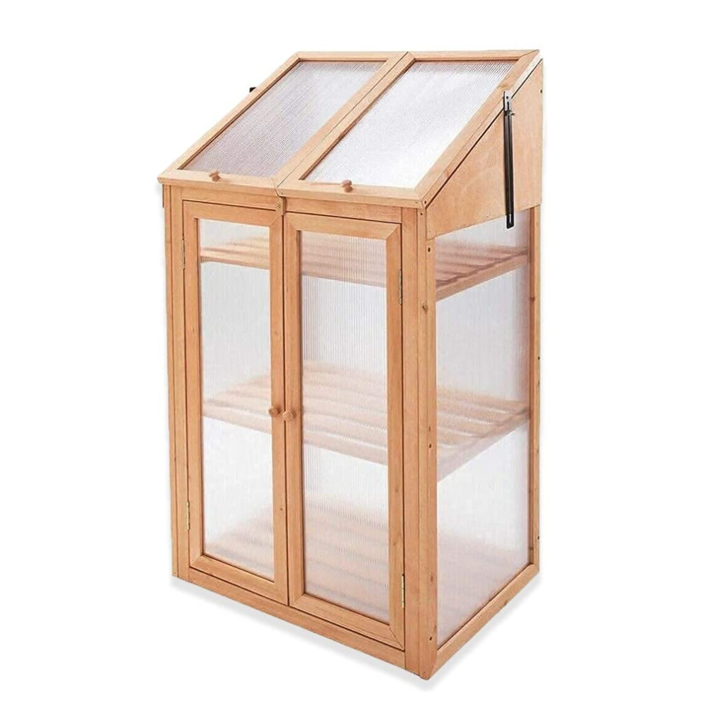 GiantexUK Mini Wooden Greenhouse, Polycarbonate Garden Cold Frame with Removable Shelves, 2 Doors and Openable Skylight, Portable Outdoor Vegetable Flower Plant Growhouse (Natural, 69x58x121cm)