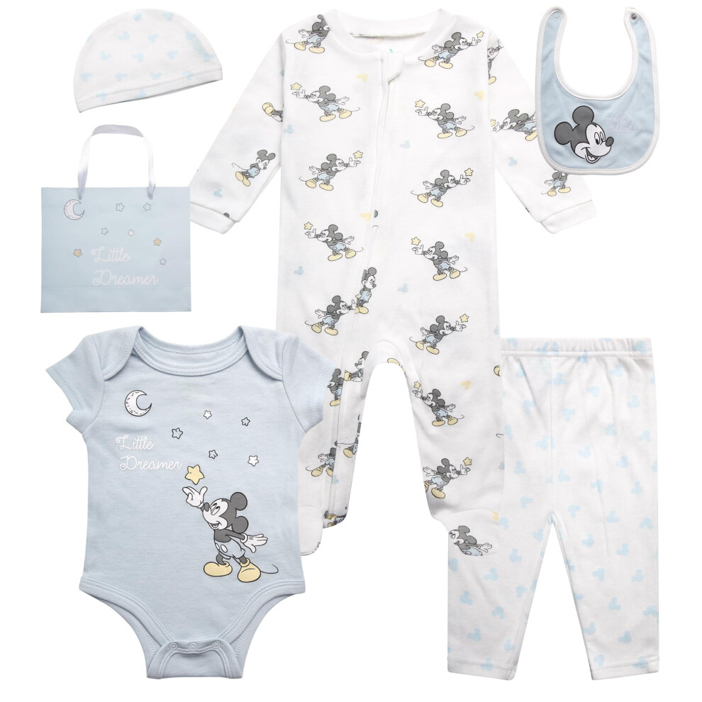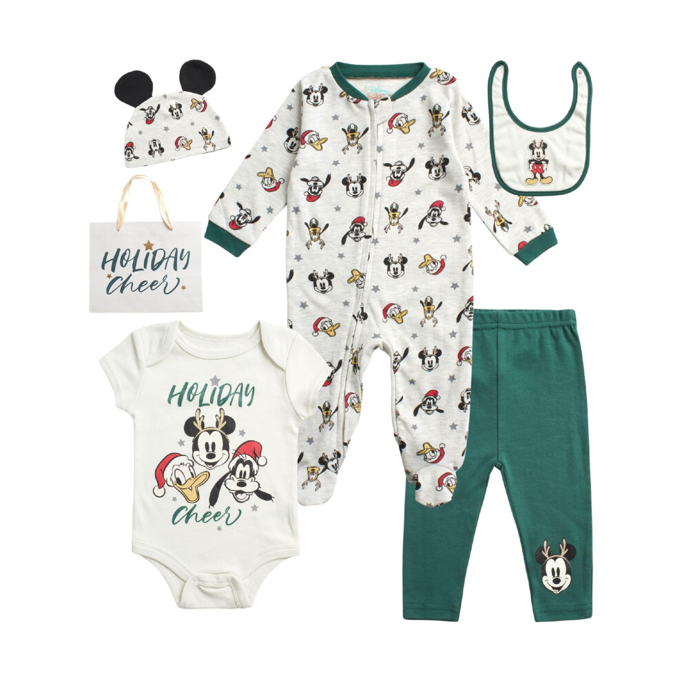 Disney Newborn Baby Girl Boy Clothes - 7 Piece Mickey Mouse Winnie the Pooh Bib Onesie Overall Beanie Pants Gift Bag Gift Set Size 3-6M Mickey & Fr