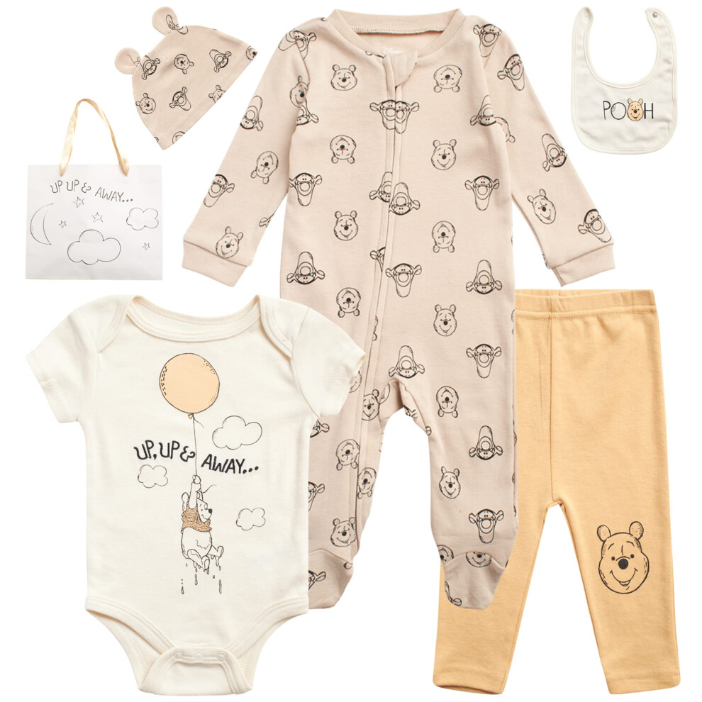 Disney Newborn Baby Girl Boy Clothes - 7 Piece Mickey Mouse Winnie the Pooh Bib Onesie Overall Beanie Pants Gift Bag Gift Set Size 3-6M Winnie/Pooh