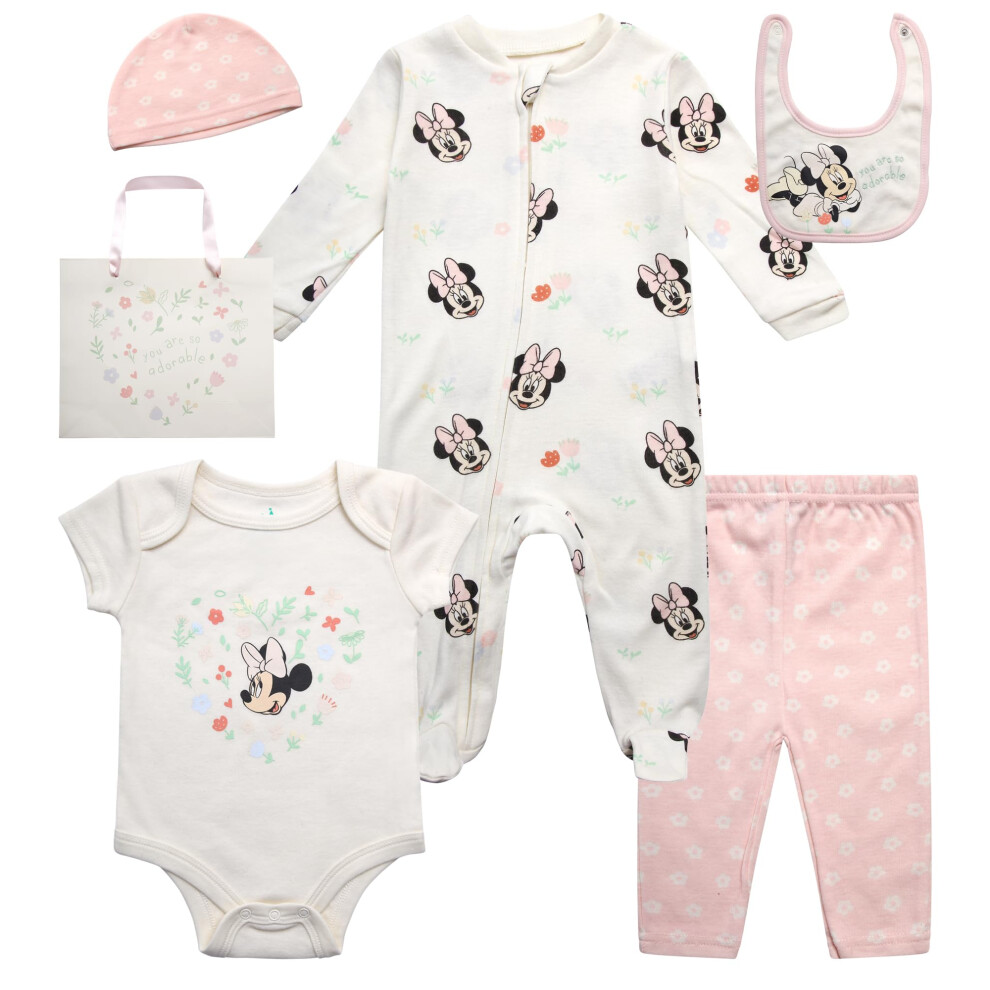 Disney Newborn Baby Girl Boy Clothes - 7 Piece Mickey Mouse Winnie the Pooh Bib Onesie Overall Beanie Pants Gift Bag Gift Set Size 3-6M Minnie Whit