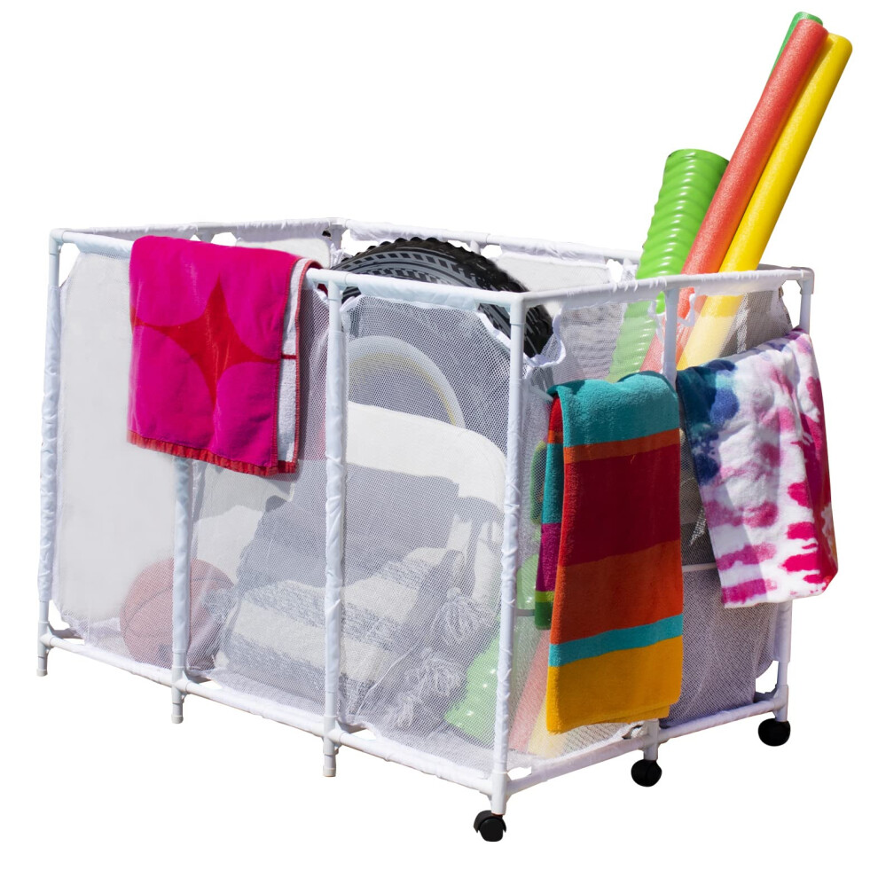 Pool Bins Pool Noodles Holder, Toys, Floats, Balls and Floats Equipment Mesh Rolling Double Decker Multi Use Storage Organizer Bin, Large with Noodle