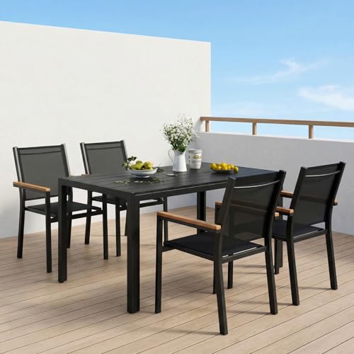 LIFERUN 5-Piece Patio Dining Sets, 110x70x73cm Aluminium Garden Table with Parasol Hole, 4 Stackable Textilene Chairs for Garden Terrace Poolside (Black, Black Table 110x70x73cm)