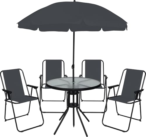 OHS 6 Piece Garden Furniture, Outdoor Table and Chairs with Matching Parasol 4 Folding Dining Chairs Round Tempered Glass Table Poolside Balcony Patio Furniture Set, Grey