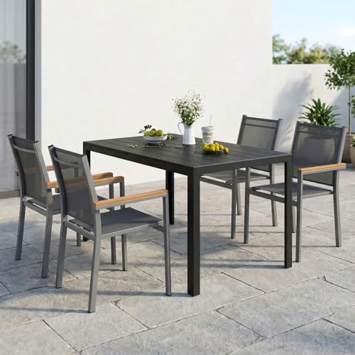 LIFERUN 5-Piece Patio Dining Sets, 110x70x73cm Aluminium Garden Table with Parasol Hole, 4 Stackable Textilene Chairs for Garden Terrace Poolside (Grey, Black Table 110x70x73cm)