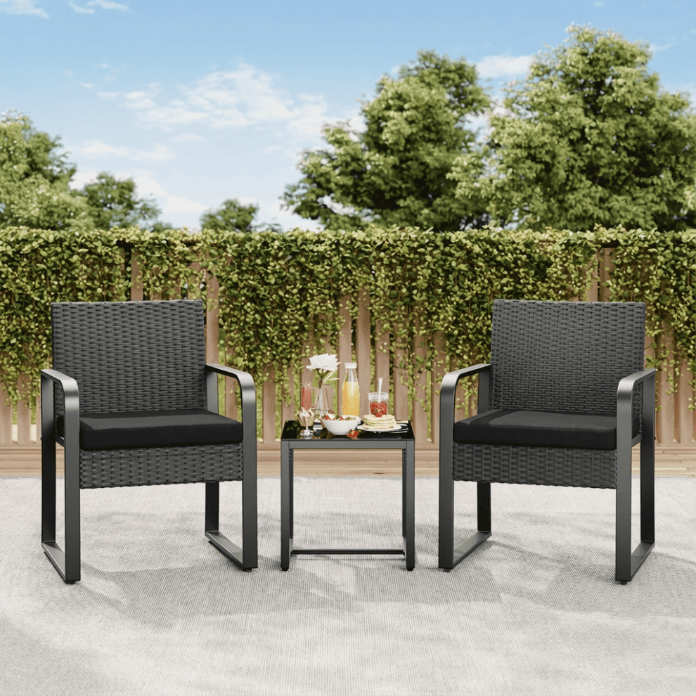 Muddy Hands 3 Piece Black Plastic Rattan Garden Furniture Set - 2 Cushioned Chairs & Table - Perfect for using Outdoor Patio Balcony Poolside