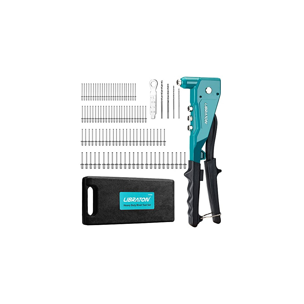LIBRATON Rivet Gun Set, Pop Rivet Gun, Heavy Duty Rivet Tool, Professional Hand Riveter, Manual Riveting Tool with 120 Blind Rivets, 4 HSS Drill Bits, 4 Tool-free Interchangeable Heads