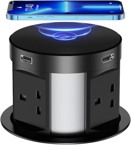 Pop Up Sockets for Kitchen Worktops with Wireless Charging, Pop Up Plug Socket with USB, Recessed Desk Power Outlet 4 UK Plug, 2 USB, 1RJ45 Port, 1 HDMI Port for Office and Home