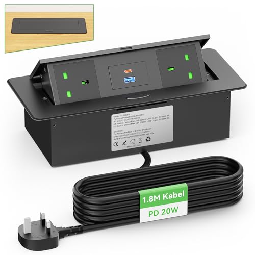 Desktop Power Socket with USB C PD20W, Aluminum Recessed Power Strip 2 UK Plug, Hidden Pop Up Sockets for Kitchen Worktops Conference Desk, Desk Power Outlet with USB C PD20W, 1.8M Cable, HANNELORE