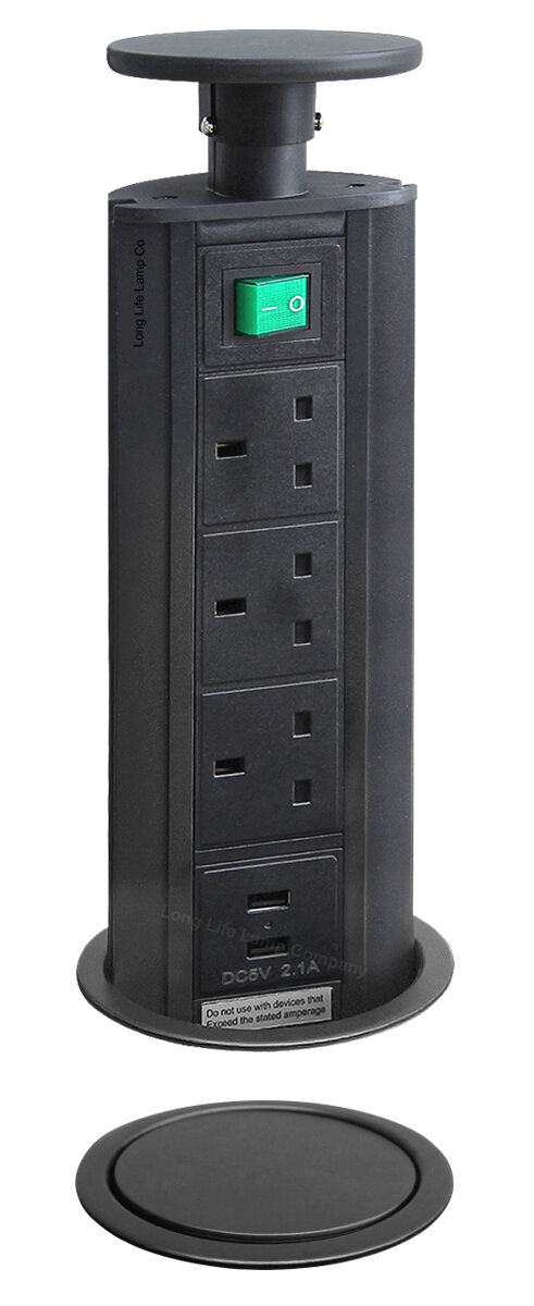 POP UP SOCKET Power POD 3 UK Sockets 2 USB with Safety Switch BLACK TOP