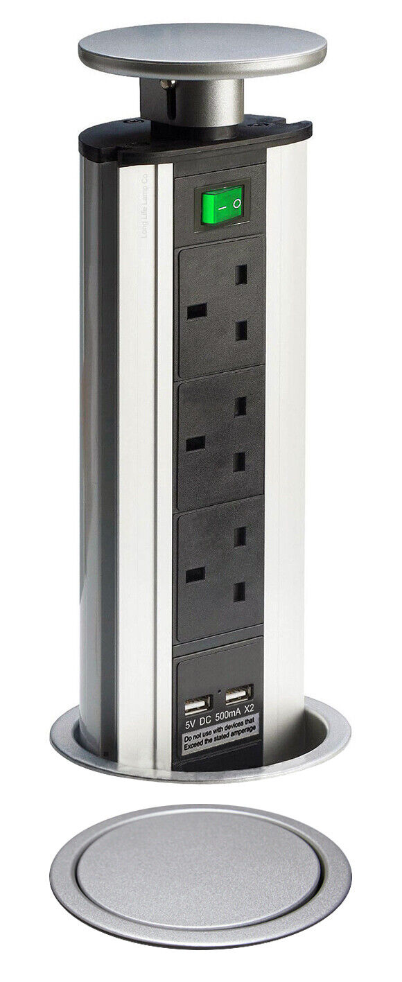 Pop Up Socket Silver Aluminium UK USB Power Plugs 240V 13A New with Switch