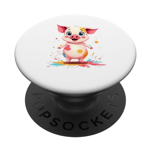 Cute Cartoon Pig Standing with Colorful Paint Splatters PopSockets Adhesive PopGrip