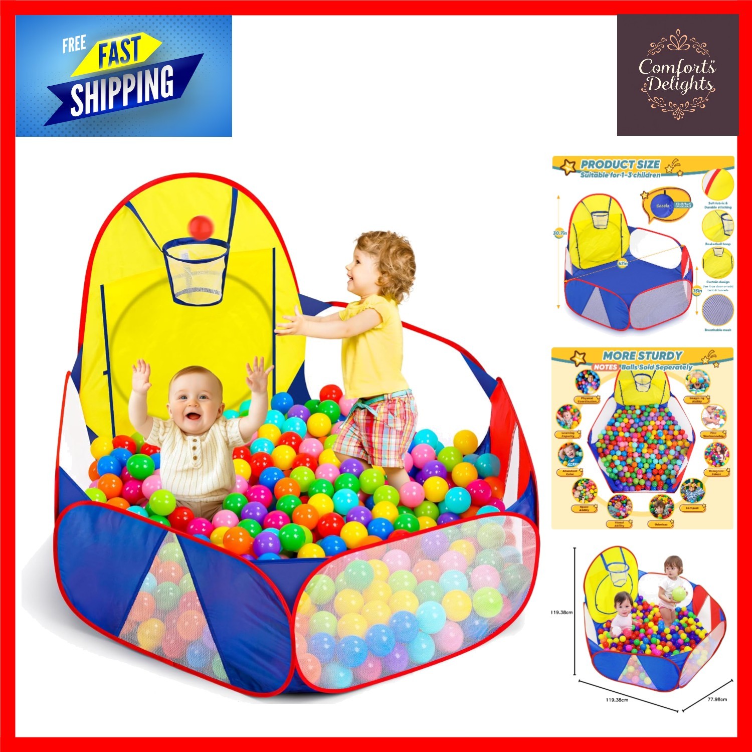EocuSun Kids Ball Pit, Indoor & Outdoor Baby Toddler Ball Pit Pool play tent, Portable Pop Up Ball Pool with Basketball Hoop and Zippered Storage Bag (Balls not Included) (Classic Edition)