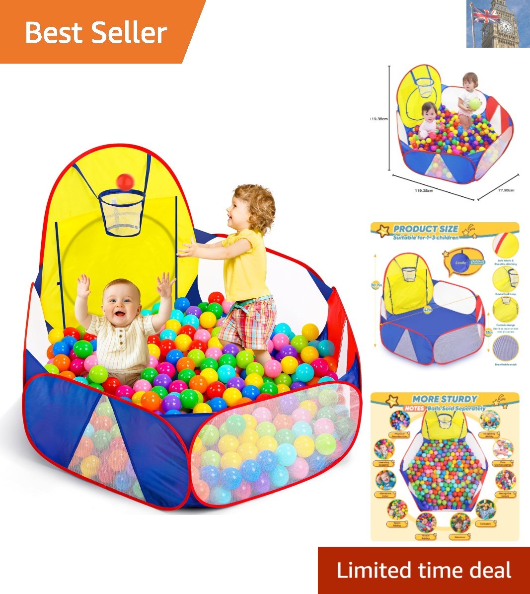 Peradix Ball Pit Play Tent/Paddling Pool 2 In 1 - Pop Up Play Tent With Sunshade And Basketball Hoop Toys For Kids/Baby -Available in all seasons