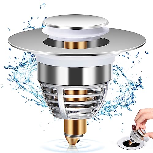 Hibbent Upgraded 3 in 1 Bathroom Sink Plug, Universal Pop Up Stopper with Removable Stainless Steel Filter Basket Hair Catcher, Sink Plug for 25-46mm Basin Hole, Brass Bullet Core, Chrome