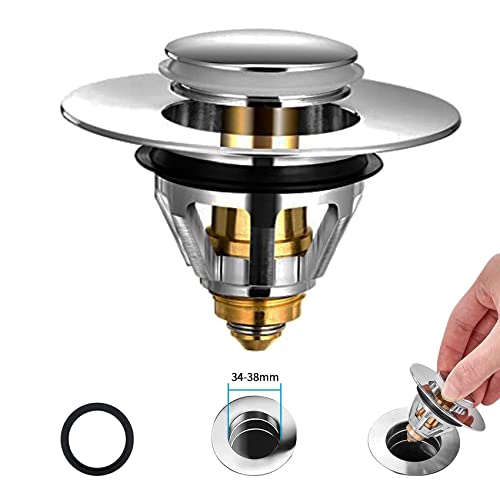 Bathroom Sink Plug Replacement, Brass Universal Pop Up Drain Stopper with Bounce Core, Bath Basin Plug Filter with Basket Hair Catcher, Push Type Sink Strainer No Overflow for Bathroom,34-38mm