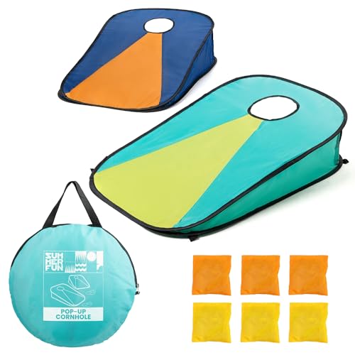 Toyrific Summer Fun Pop-Up Cornhole Game Set, Portable Bean Bag Toss Game with Carry Bag, Includes Yellow and Orange Cornhole Bags, Easy Setup Outdoor Family Fun for Garden and Beach