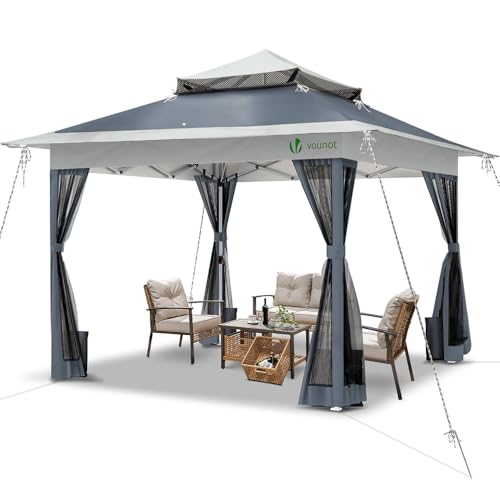 VOUNOT 3.6m x 3.6m Pop Up Gazebo with Central Lock System, Mesh Sides, Garden Double Roof Marquee Party Tent with Leg Weights & Roller Bag, Grey