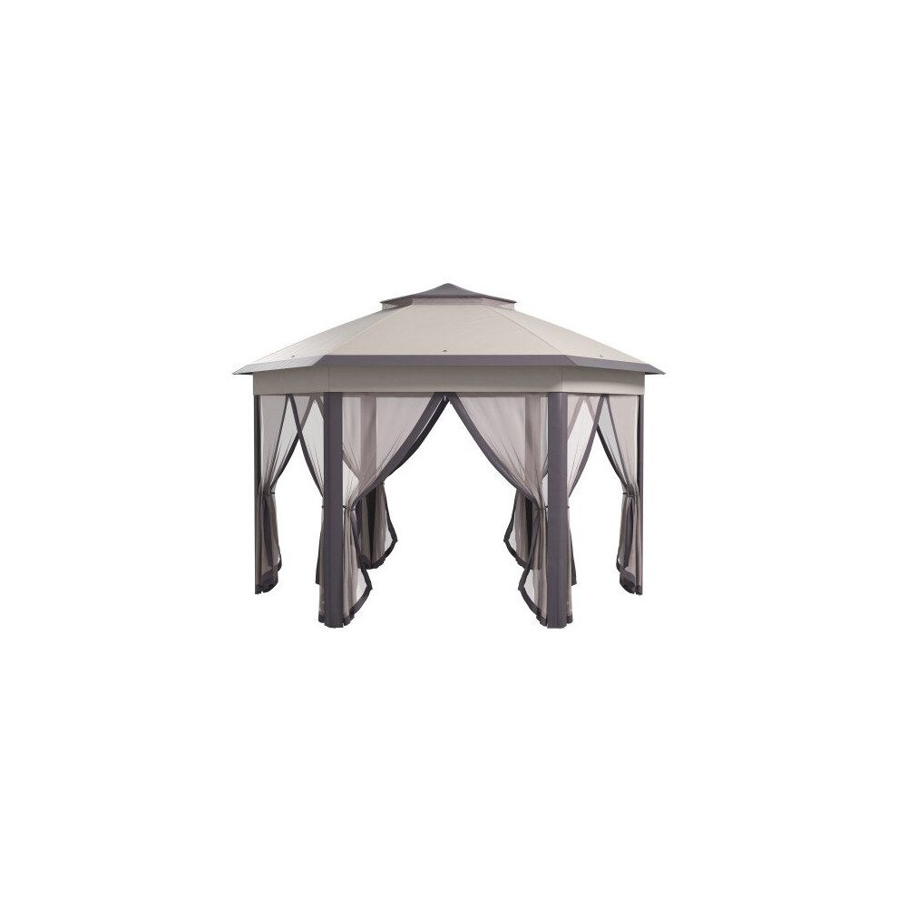 Outsunny 3 x 4m Garden Gazebo Hexagon Pop Up Gazebo Party Tent Canopy Double Roof Instant Shelter with Netting and Carry Bag for Outdoor Patio, Beige