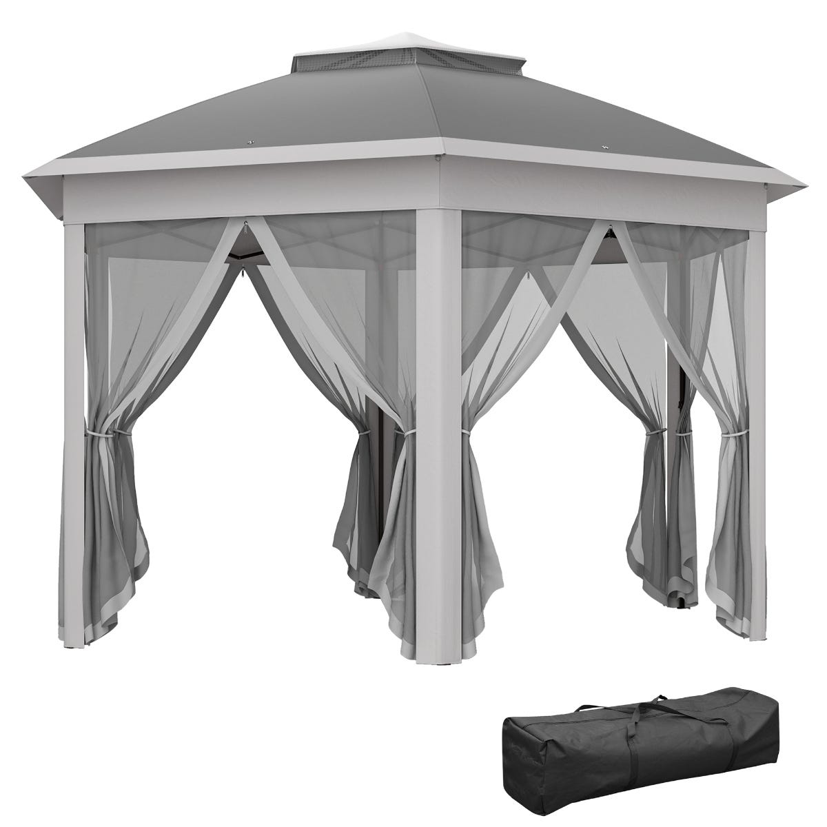 Outsunny 3m x 4m Pop-Up Hexagonal Double-Roof Garden Gazebo with Netting and Carry Bag - Dark Grey, Grey