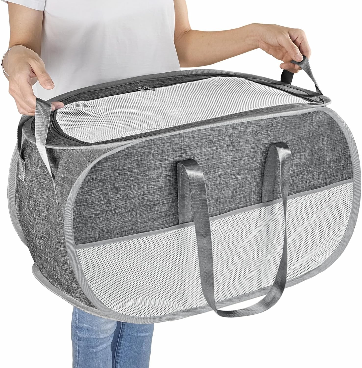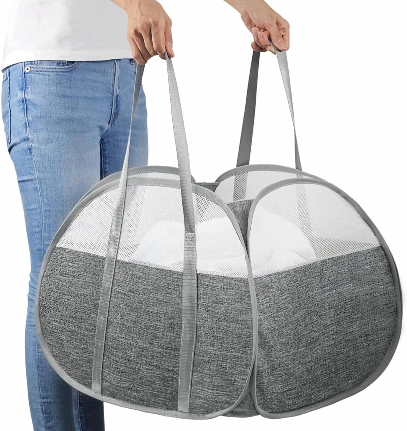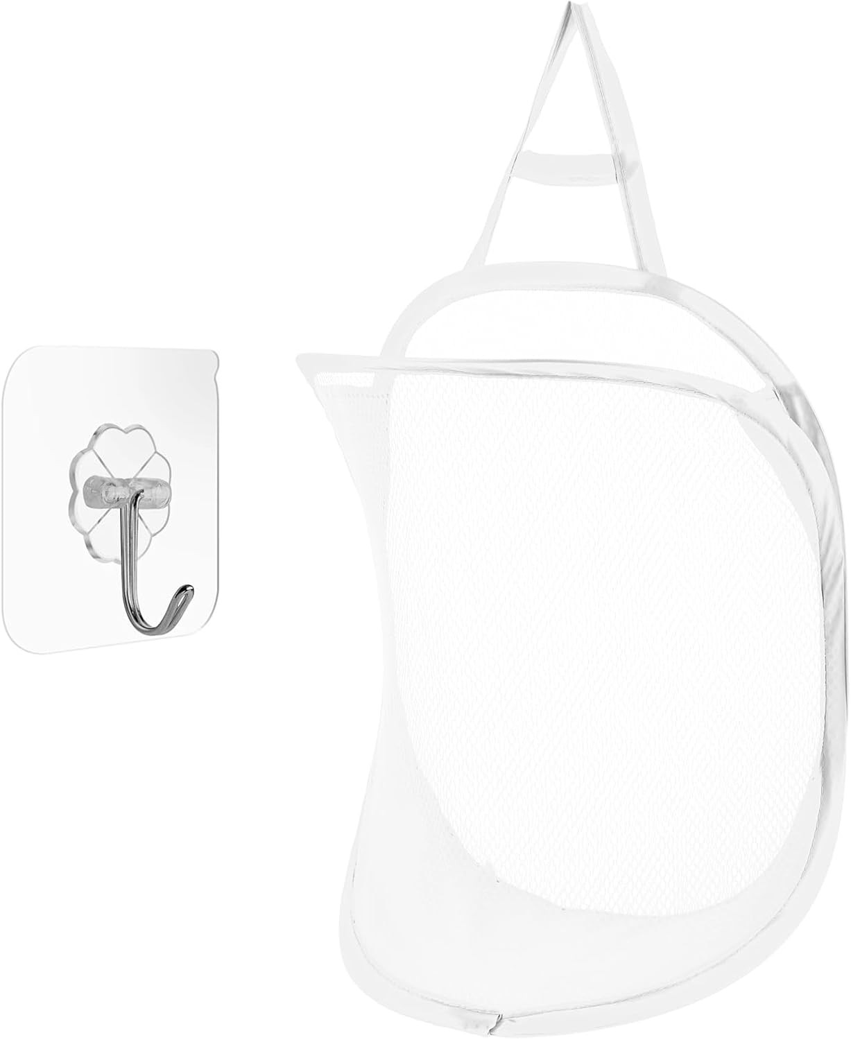 Mesh Pop Up Laundry Hamper with Durable Handles - Portable Collapsible Clothes Baskets for Dorm, Bathroom & Travel (White)