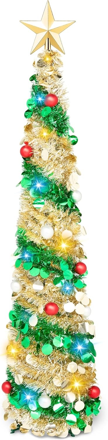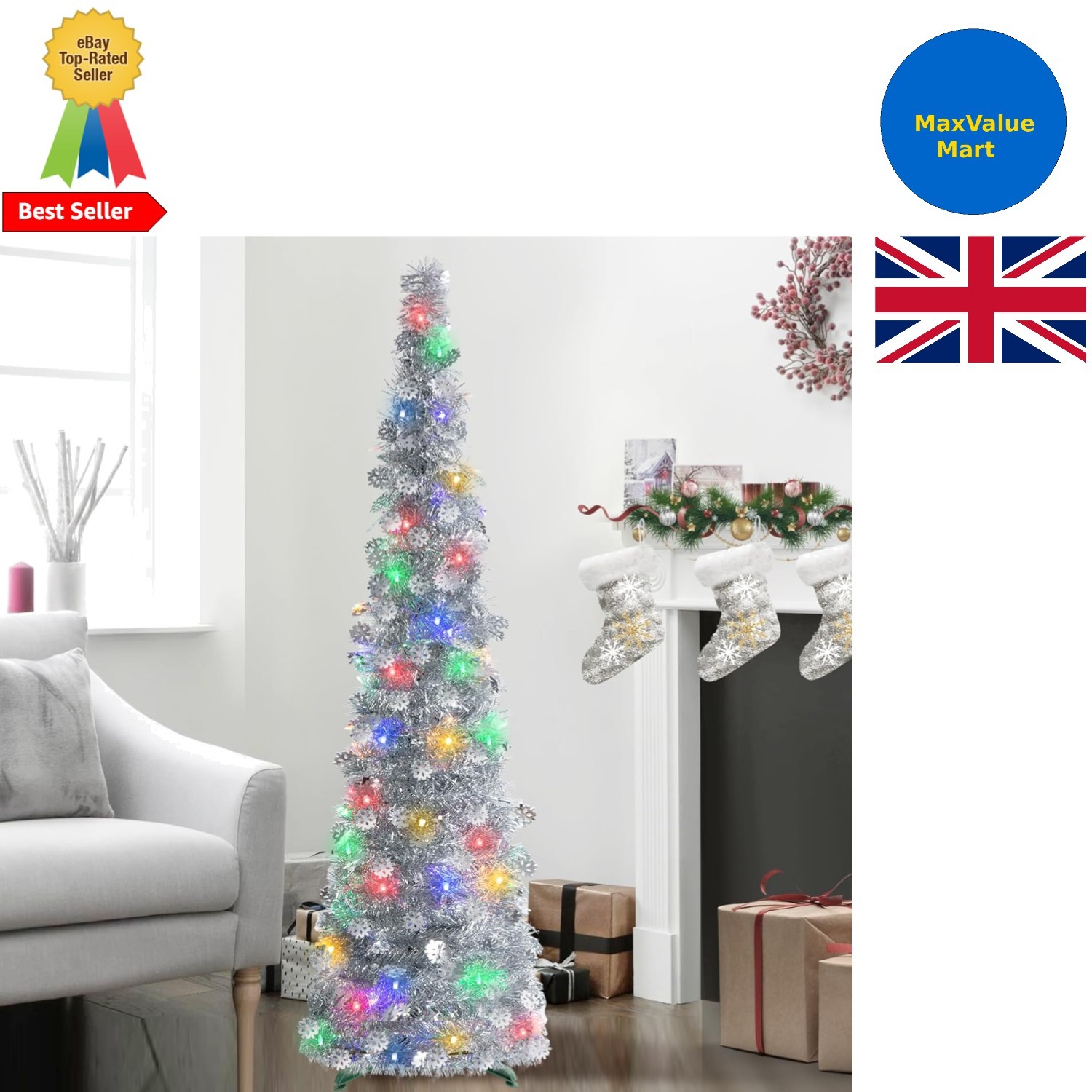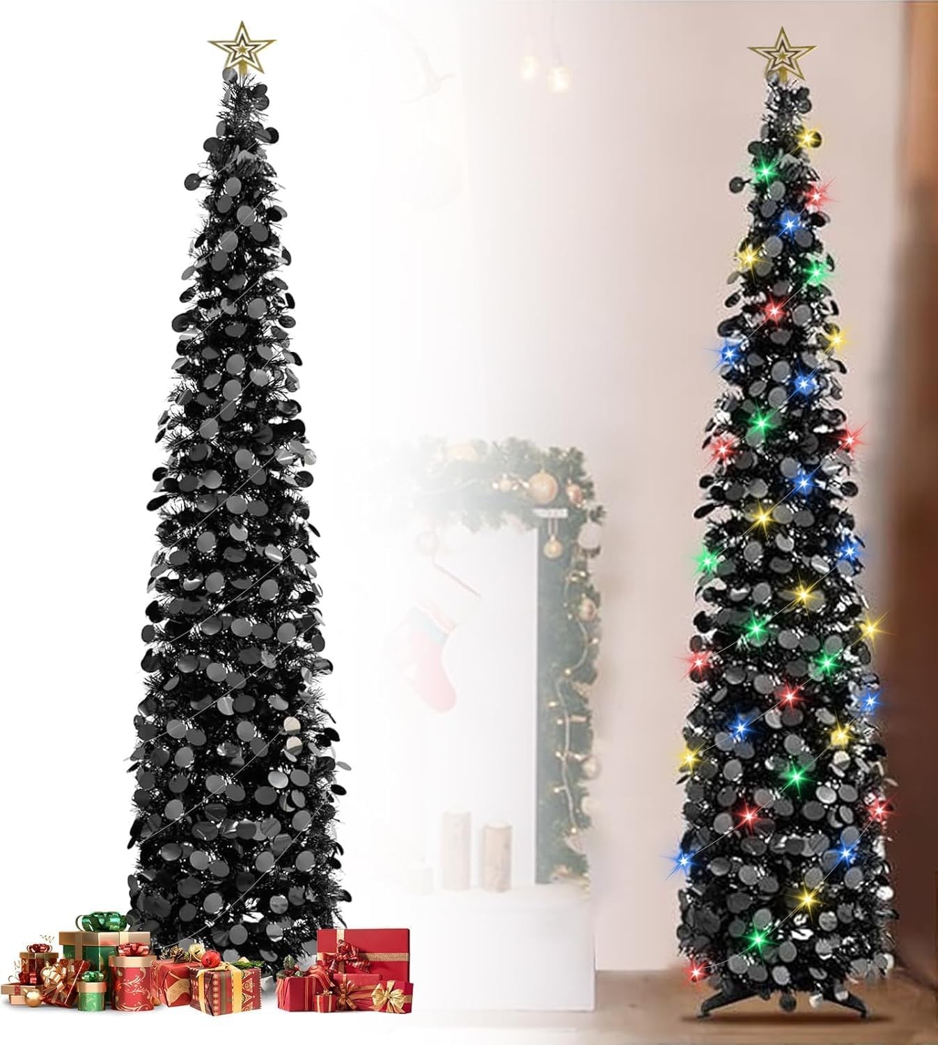 5 Ft Pop up Pencil Christmas Tree Tinsel with Lightsand Star, Collapsible Christ
