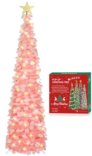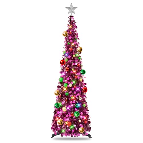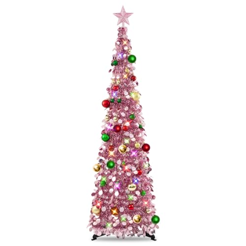 HMASYO 5FT/1.5M Pop Up Christmas Tree with Timer Lights, Pink Tinsel Christmas