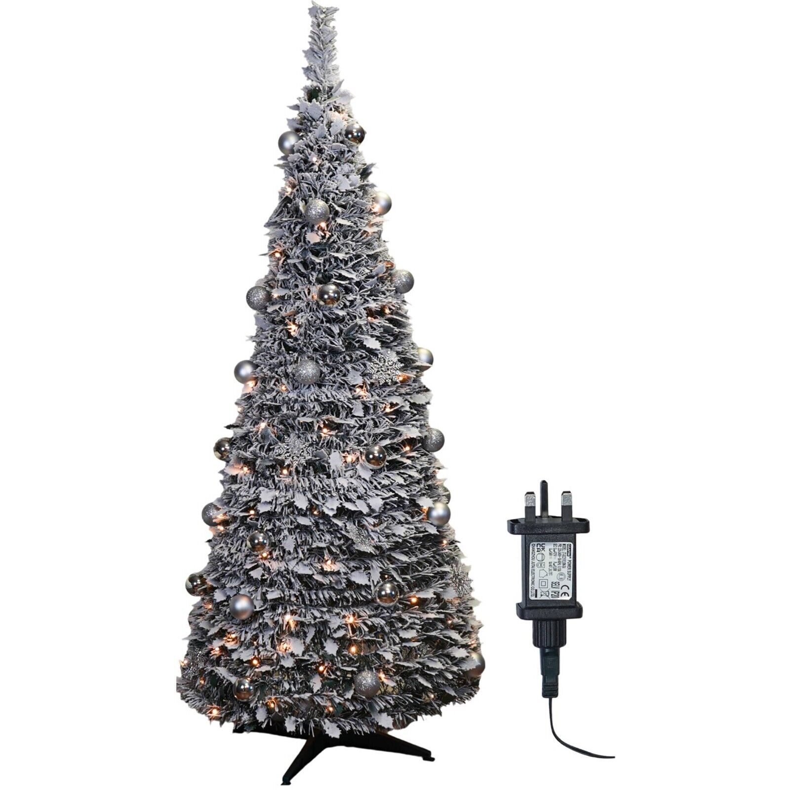Christmas Pop-Up Pre Decorated Tree 200 LED Lights Frosted Silver Baubles 2.1m