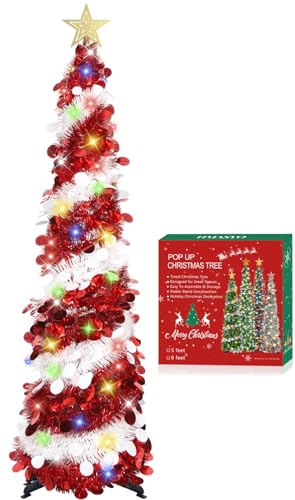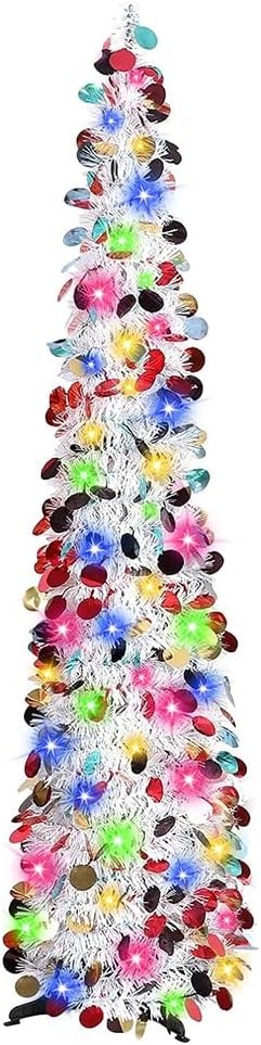 Orgrimmar 5FT Artificial Christmas Pop Up Tree Christmas Tinsel Pencil Tree with 100 Multi-Color LED Lights for Holiday Home Party Decoration (Multi)