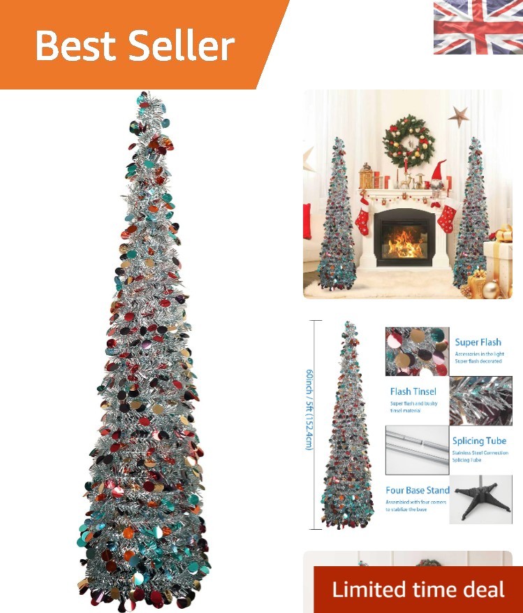 5Ft/1.5M Pop Up Collapsible Christmas Tree with Lights, Silver Tinsel Skinny Pe