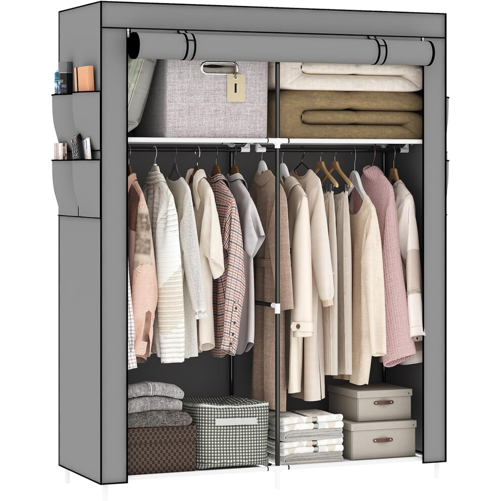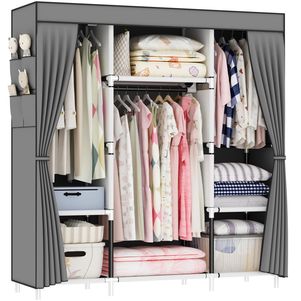 (Grey) Bedroom canvas wardrobe, fabric wardrobe with 2 storage area side pockets, pop-up wardrobe is perfect for temporary wardrobe in bedroom