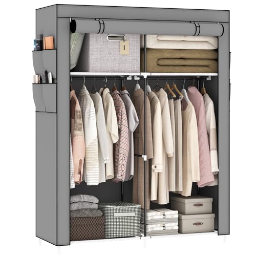 OPPAIYA Canvas Wardrobes, Fabric wardrobe for bedroom With 2 Hanging Rails, 4 Storage areas、8 Side Bags, 165 * 45 * 105cm Temporary wardrobes, Pop up wardrobe - Gray