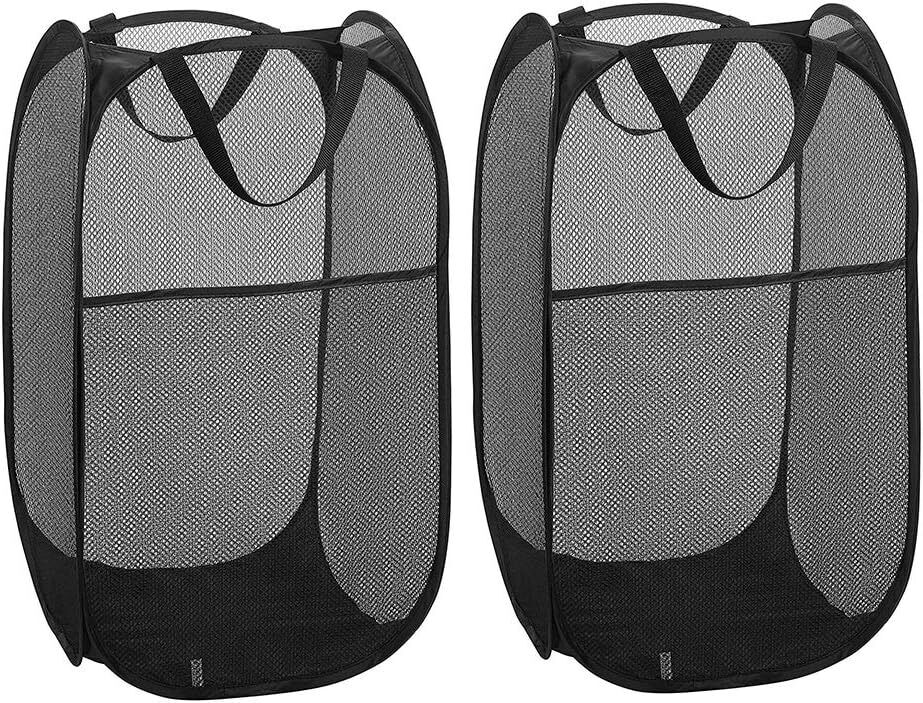 SYVOFOX 2 Pack Mesh Collapsible Laundry Baskets, Pop up Laundry Hamper Bins,Folding Washing Basket with Handles for Clothes Tidy Storage-Black