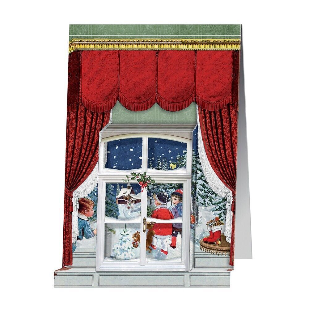 Red Curtain 3 d Christmas Window Advent Calendar Card Pop up.