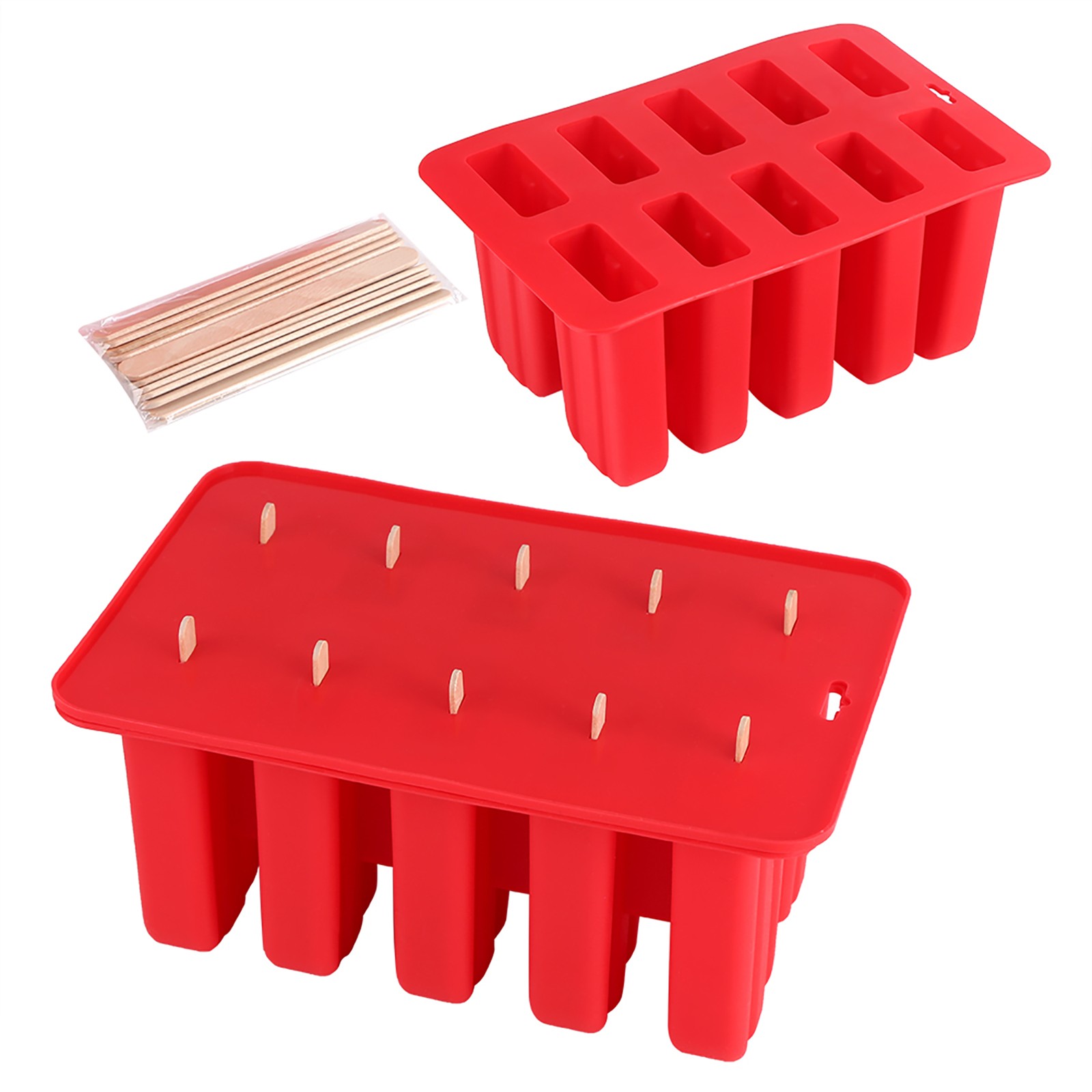 10 With Silicone Popsicle Ice Cream Mold With Lid + 12 Wooden Sticks (red)