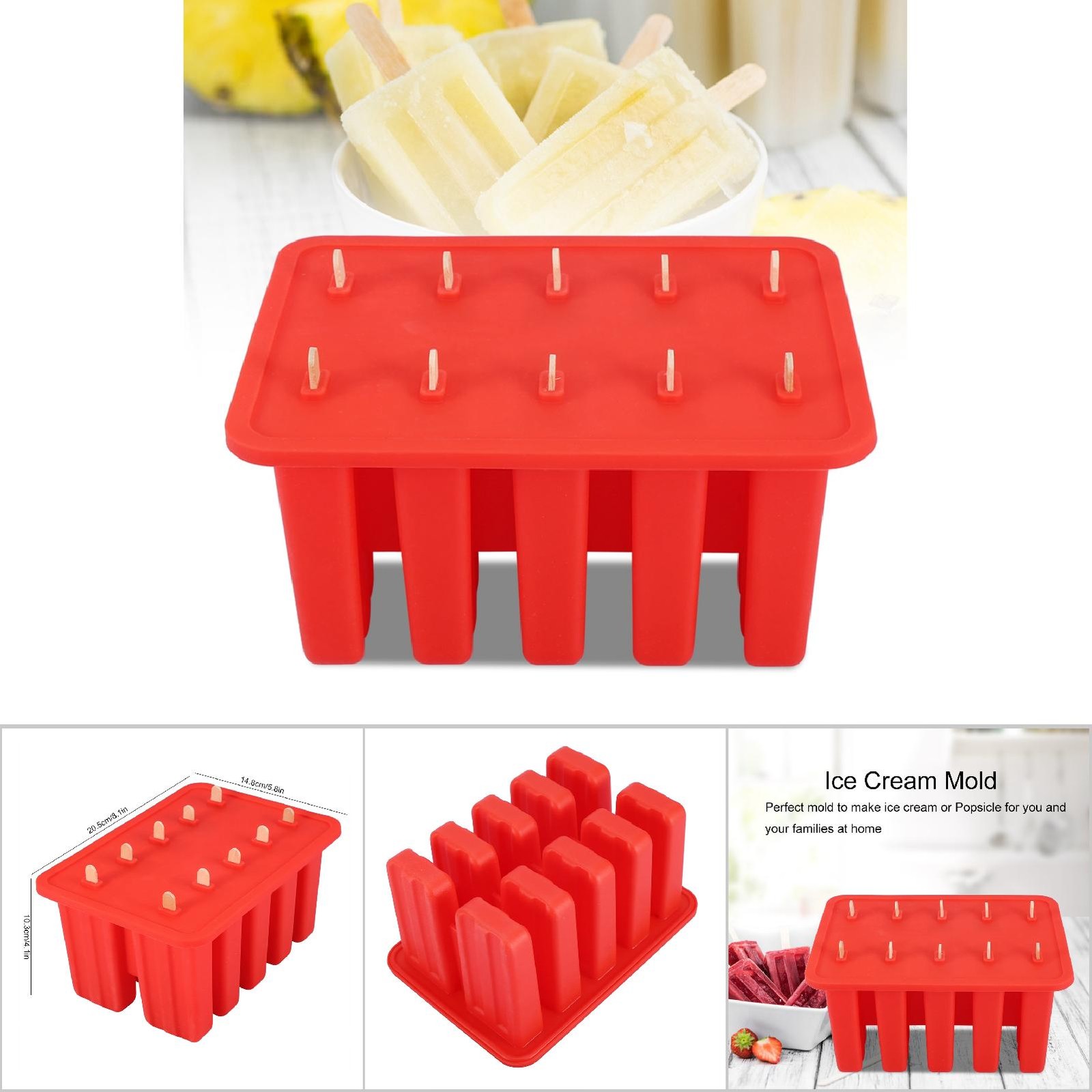 .›10 Cells Silica Gel Ice Cream Mold Popsicle Maker With 50 Sticks (Red)