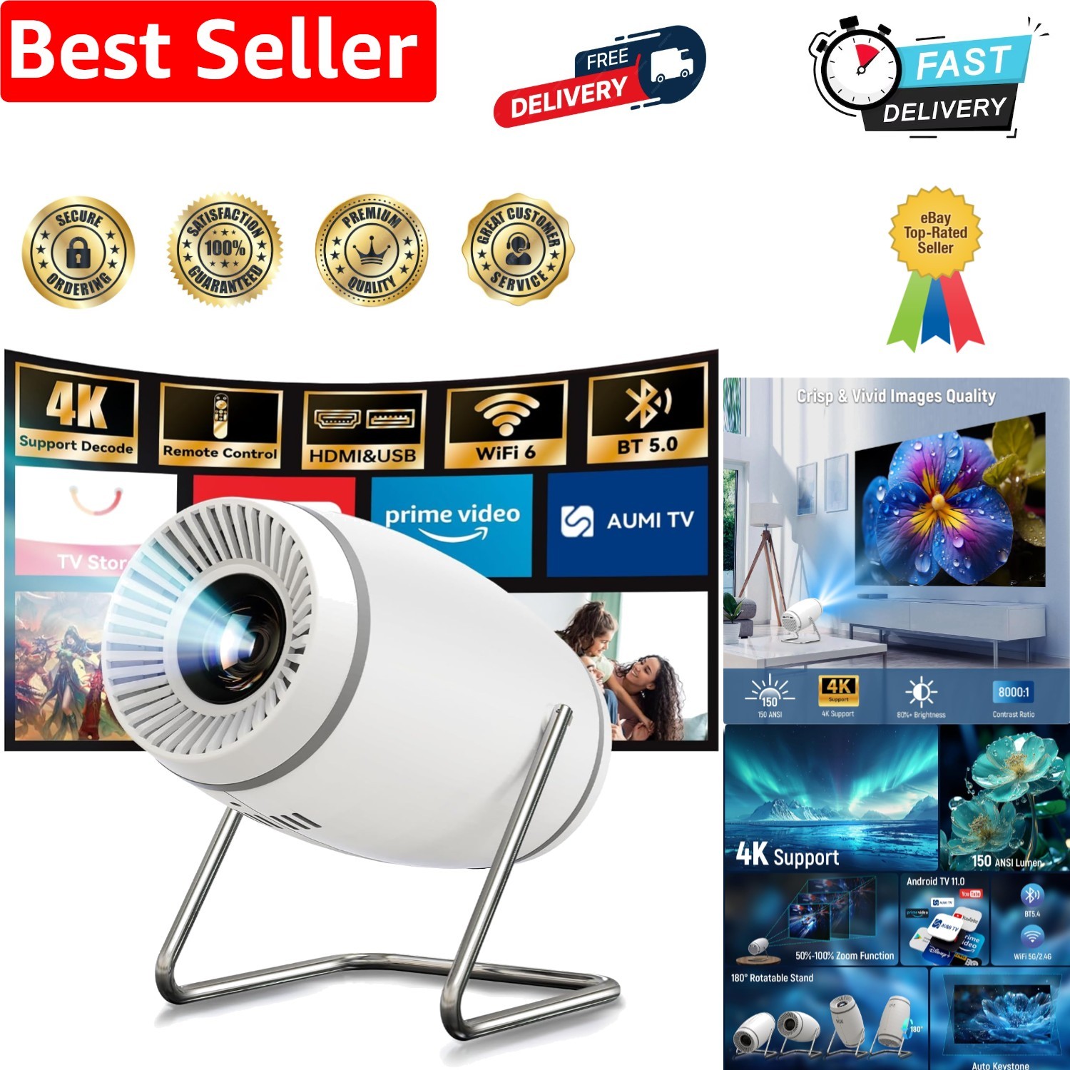 5G WiFi 6 Android 11 Portable 4K LED Projector - 10000 Lm, 40-130 inches, HDMI USB, Bluetooth, Auto Keystone, 180