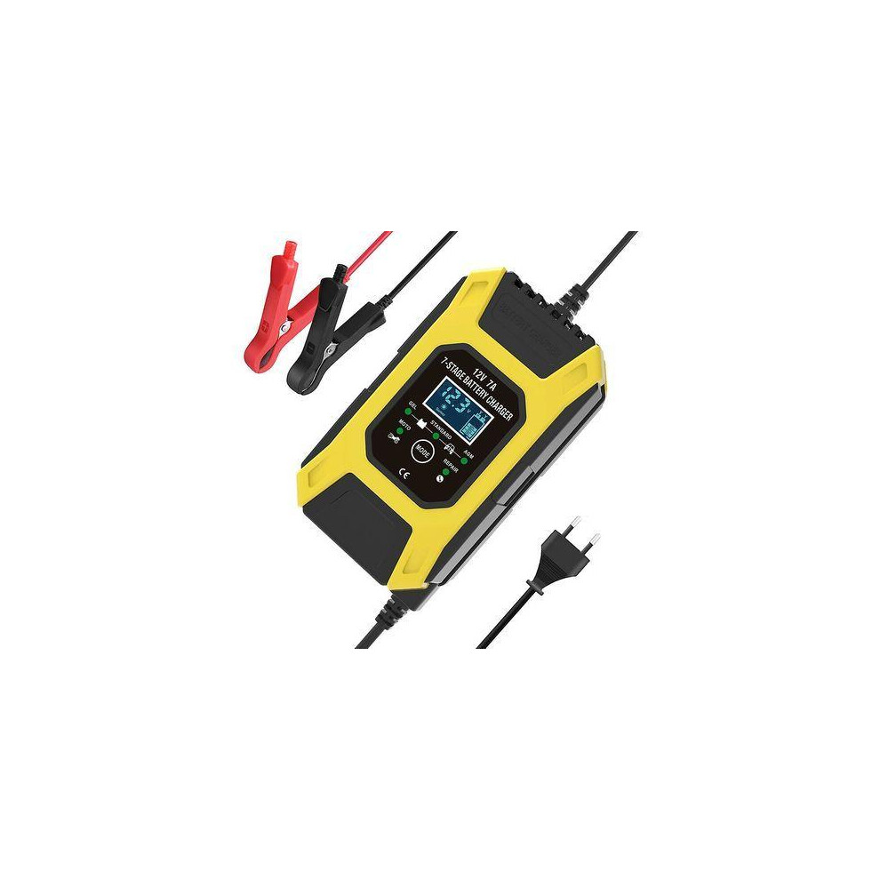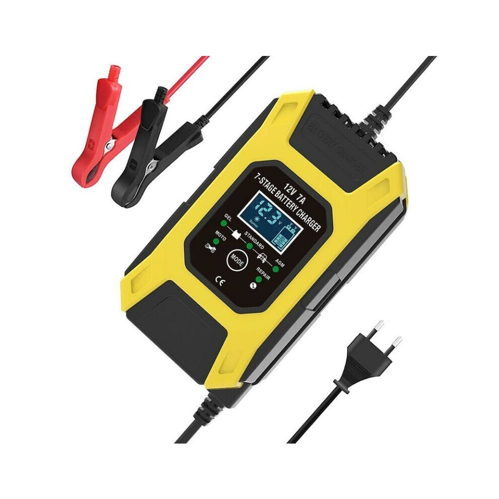 7A/12V Smart Battery Charger Portable Fast Motorcycle Charger with LCD Display Protection Repair Mode for Car Motorcycle Auto Yellow