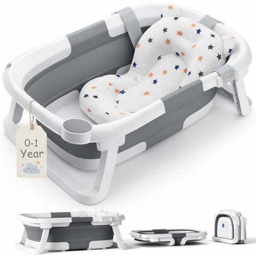 DEANIC Baby Bath Tub for 0-6-12 Months Newborn, Foldable Toddler Bath with Soft Cushion Pad, Portable Baby Bathtub Travel Save Space (Grey)