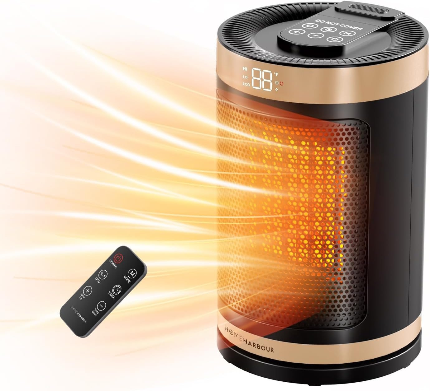 Home Harbour Cozy Heat 1500W Electric Space Heater, Portable Ceramic Fan Heater, Energy Efficient, 3 Modes, LED Display, 12H Timer, Overheat & Tip-Over Protection, 15°C-45°C, Gold for Home/Office