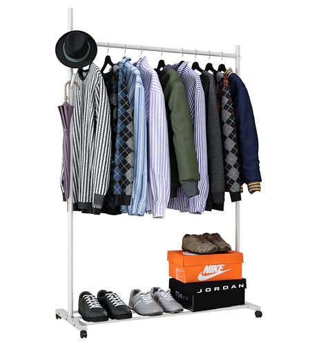 SINGAYE Clothes Rail Clothing Rack:Drying Portable Clothes Rail with Hook and Wheel Metal Freestanding Storage Shelf Storage for Bedroom Closet Laundry White