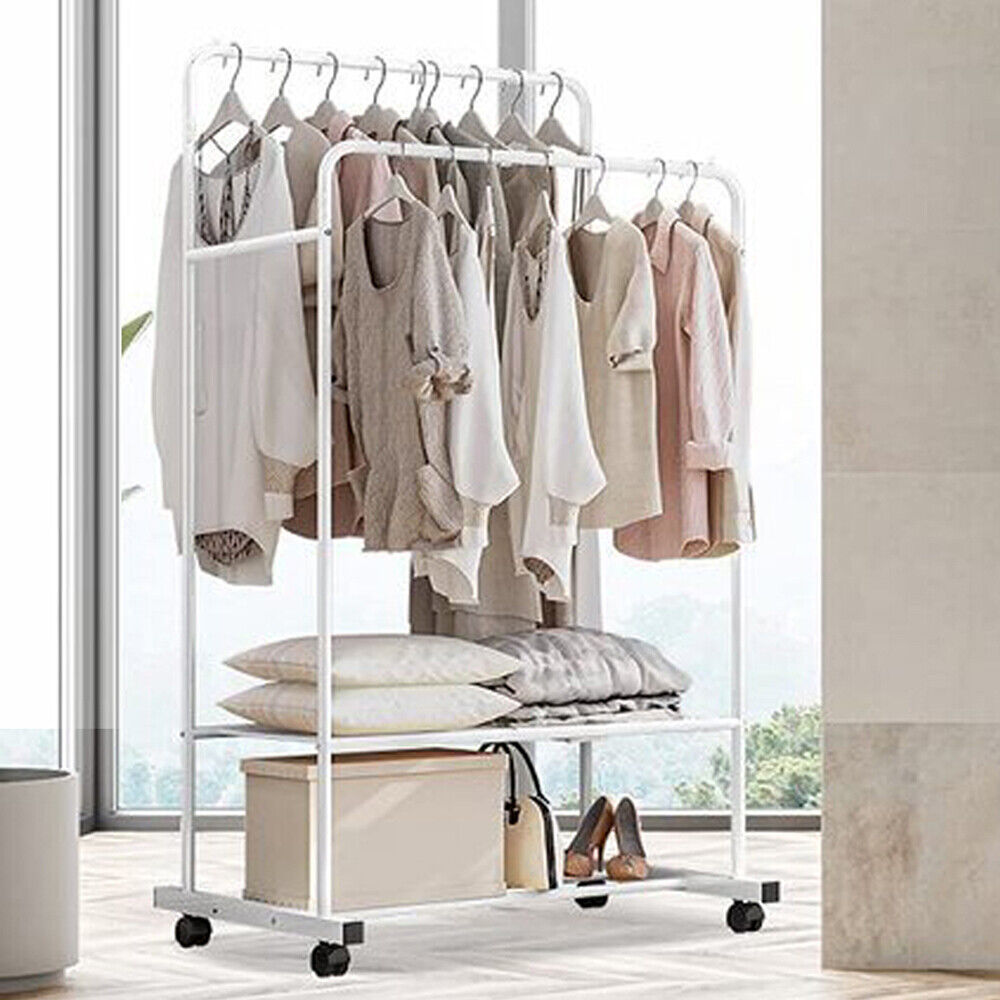 Portable Rolling Clothes Rail Metal Dual-bar Garment Rack Stand Corner Boutique