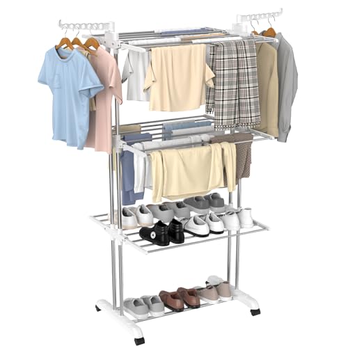 Innotic Clothes Drying Rack Foldable 4 Tier Clothes Airer Stainless Steel Portable Clothes Rail Laundry Dryer Hanger Rack with Wheels for Indoor Outdoor, White+Grey