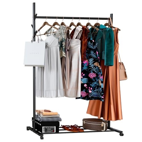 SINGAYE Clothes Rail Clothing Rack:Drying Portable Clothes Rail with Hook and Wheel Metal Freestanding Storage Shelf Storage for Bedroom Closet Laundry Black