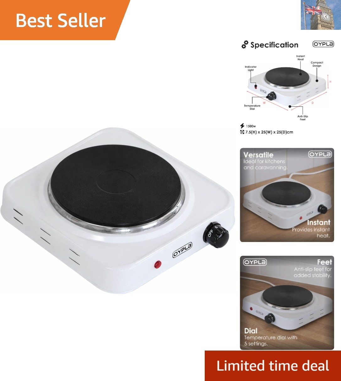 1.5kW Electric Portable Hot Plate – Single Burner with Dual Temperature Control