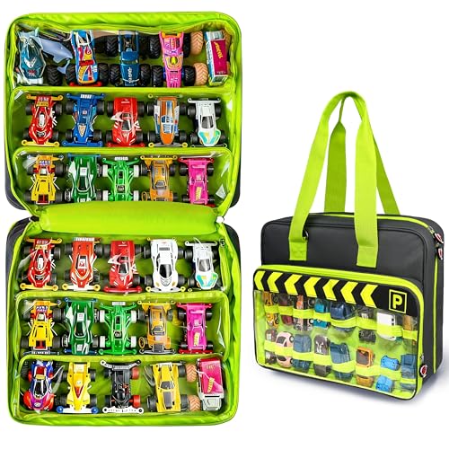 amiumuca Monster Truck Carrying Case with 6 Transparent PVC Zip Bags - Holds 34pcs 1:64 Scale Monster Trucks, Portable Storage Garage with Handles & Shoulder Strap (grey)