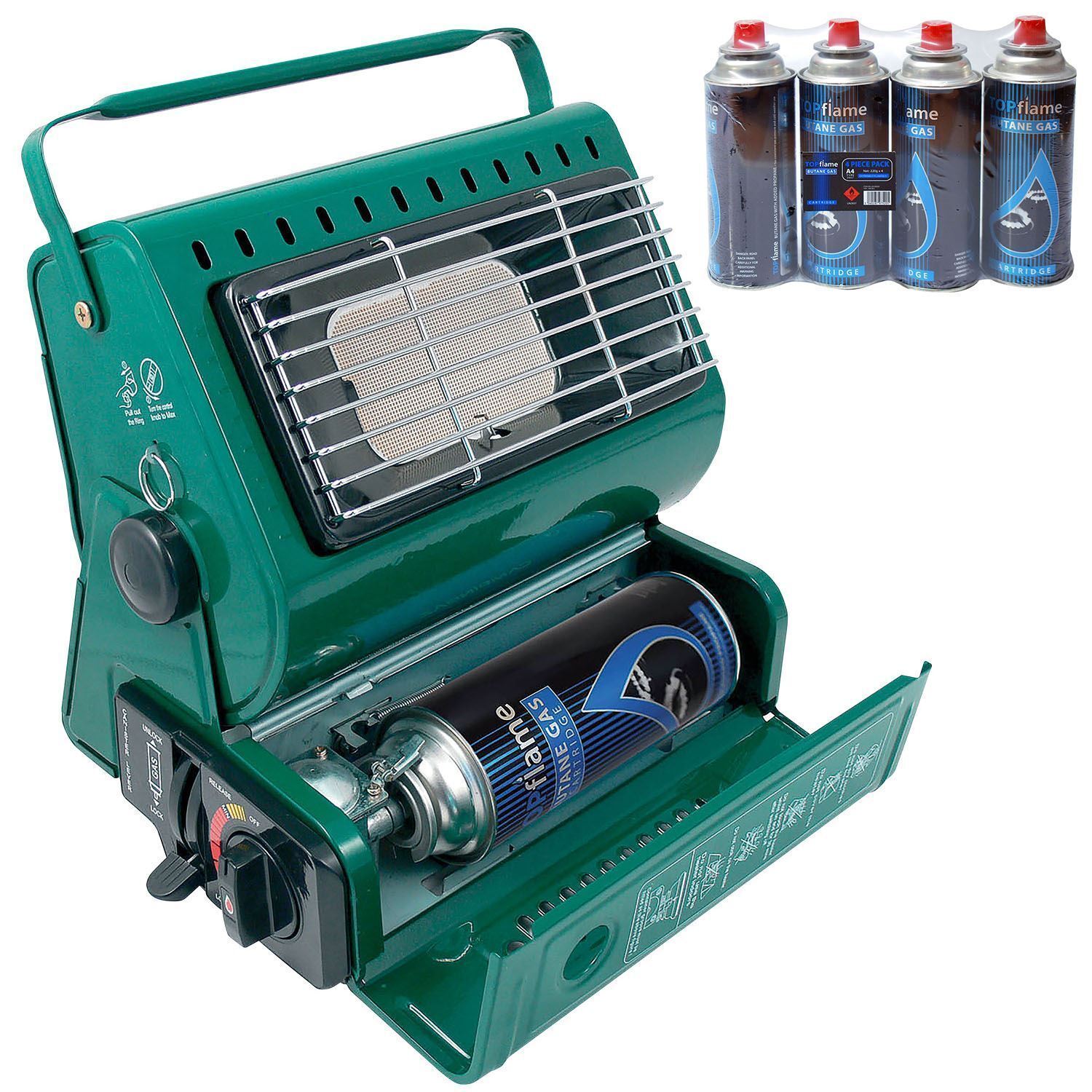 PORTABLE GAS HEATER OUTDOOR CAMPING FISHING + 4 BUTANE GAS BOTTLES CANISTERS GRE